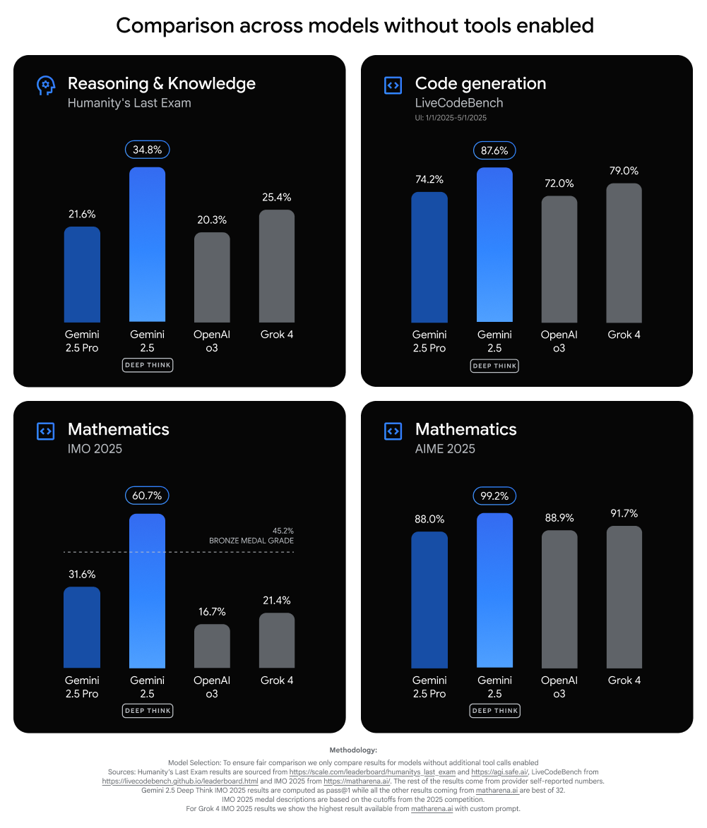 أطلقت Google DeepMind نموذجها الأحدث Gemini 2.5 Deep Think، وهو أول نموذج متعدد الوكلاء متاح للعامة، قادر على معالجة الأسئلة عبر عدة وكلاء ذكاء اصطناعي بالتوازي ثم اختيار أفضل الإجابات، ما يعزز قدراته في الإبداع، التخطيط الاستراتيجي، وحل المشكلات المعقدة مثل تصميم مواقع ويب كاملة أو حل مسائل رياضية معقدة. سيتاح النموذج لمشتركي باقة Ultra بقيمة 250 دولار شهريًا بدءًا من الجمعة.