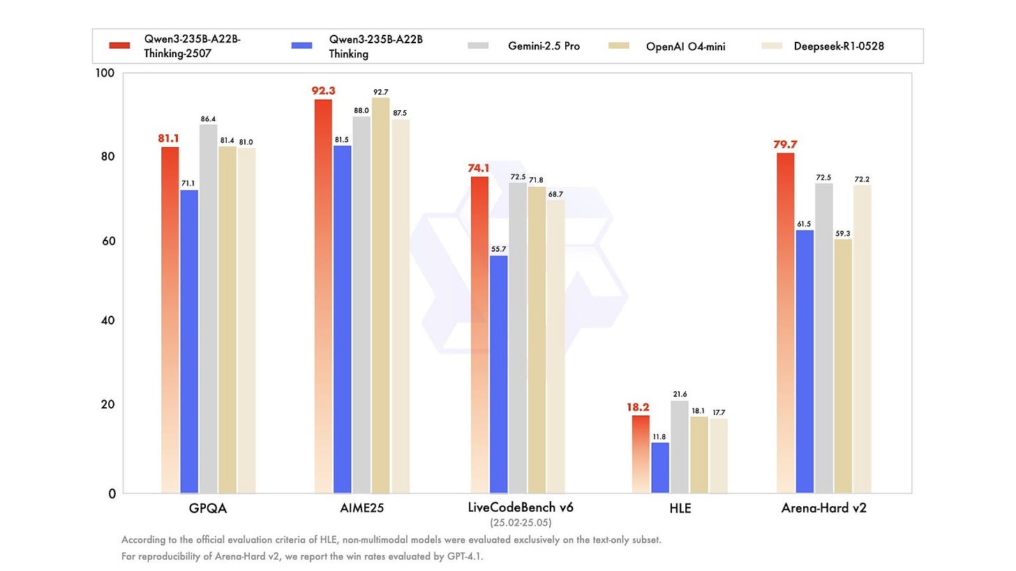 وقد أظهر النموذج أداءً لافتًا في عدة اختبارات معيارية؛ إذ حصل على المركز الأول في AIME25 بنتيجة 92.3، متفوقًا على o4-mini وGemini-2.5 Pro، وتصدر أيضًا اختبار LiveCodeBench v6 بنتيجة 74.1. كما أحرز أداءً قويًا في اختبار GPQA للأسئلة المتقدمة، وتفوق في اختبار Arena-Hard v2 من حيث التفضيل البشري.